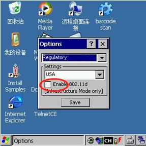 2、點(diǎn)擊上圖彈出菜單中的“Options”,在彈出的窗口中上部下拉框中選擇“Regulatory”,然后將下面“Settings”中“Enable 802.11d”前面的勾去掉,注意,這個(gè)選項(xiàng)經(jīng)我試驗(yàn)必須將勾去掉,因?yàn)閲鴥?nèi)的無線網(wǎng)一般是802.11g,按理說這個(gè)802.11d選中應(yīng)該沒事的,但選中它時(shí),無線網(wǎng)就連不上!設(shè)置后應(yīng)該是下圖的樣子: