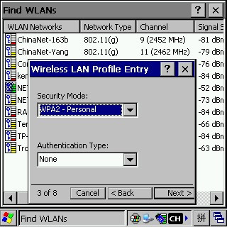 6、繼續(xù)點(diǎn)“Next”,出現(xiàn)“Security Mode”和“Authentication Type”的設(shè)置,這里需要注意的是,這兩個(gè)選項(xiàng)與具體的無線網(wǎng)絡(luò)設(shè)置有關(guān),最好進(jìn)入無線路由器的管理界面里弄清楚無線設(shè)置,一般Security Mode選“WPA2 - Personal”,Authentication Type選None: