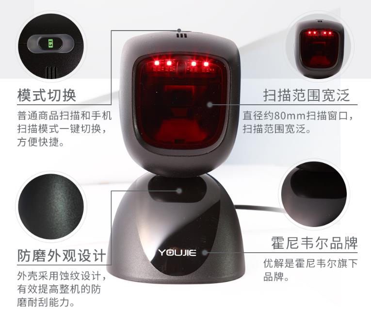 隨著二維碼應用的日益廣泛,如何選擇一款高性價的掃描器成為用戶關注的焦點。新推出的霍尼韋爾 Youjie HF600 是一款設計領先、性能優越的二維固定式條碼掃描器,可廣泛應用于商業零售、物流追蹤、藥店管理、辦公自動化等眾多場合。